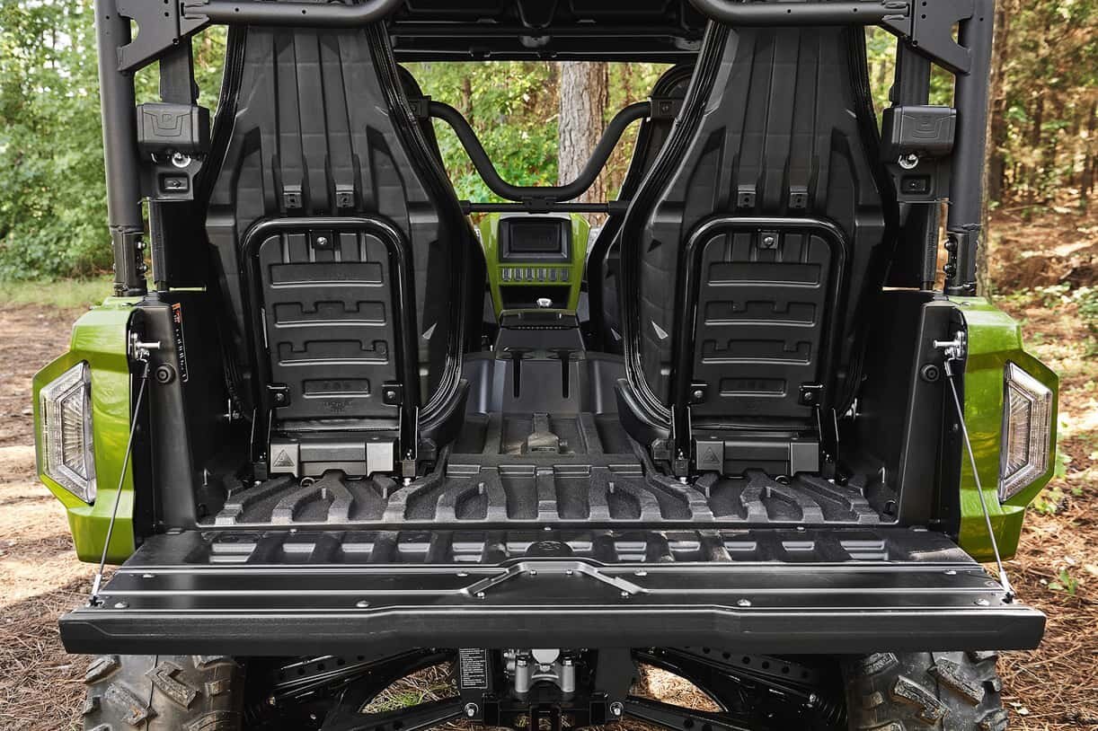 • The Wolverine® RMAX™4 1000 is one of the most versatile machines in the two-row side-by-side market. In addition to its ability to comfortably seat one, two, three or four adults, including cargo, the Wolverine RMAX4 1000 features an ingenious storage system for cargo flexibility. By folding and sliding the rear seats forward, the rear area expands and securely transports up to 600 pounds of cargo with its multiple steel tie-down points. The Wolverine RMAX4 1000 also features a built in 2-inch receiver to tow a full 2,000 pounds when needed.
